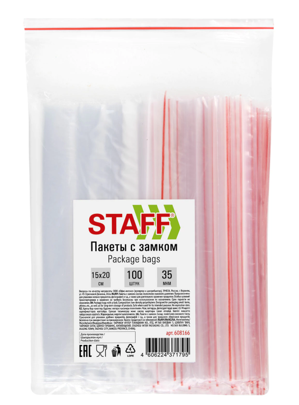 Пакет с замком прозрачный 35мкр. пакет 100 шт. (Staff  608166) 20см х 15см ПВД [1]