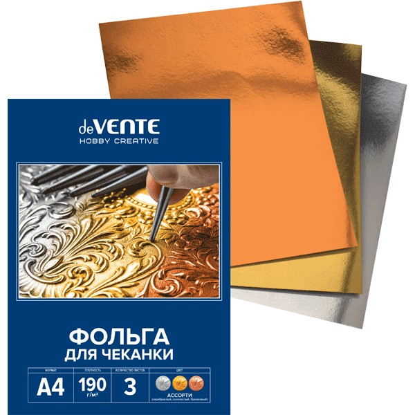 Фольга для чеканки A4 190 г/м², 3 л, в картонной папке, ассорти (серебристая, золотистая, бронзовая)